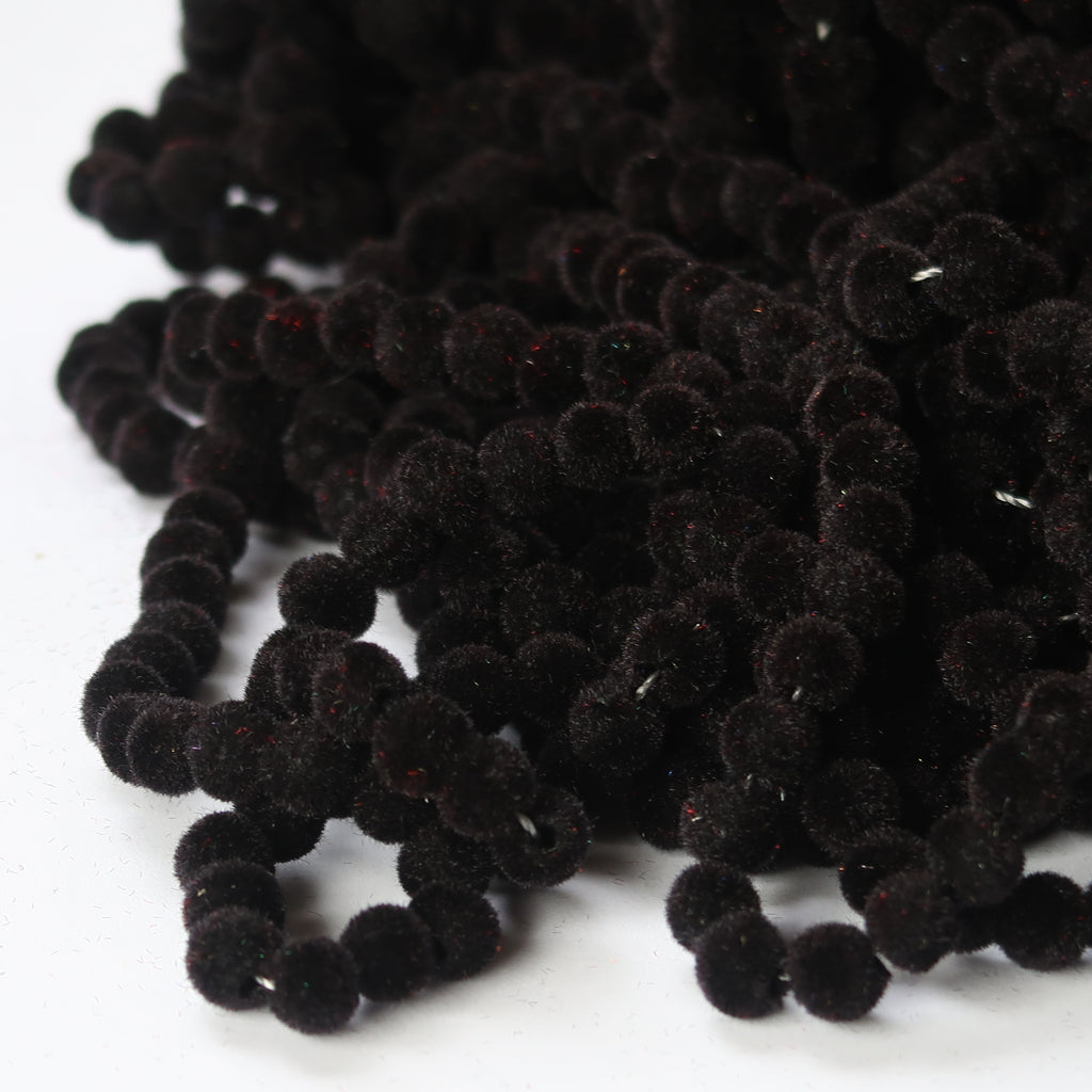 Round furry bead. Flocked plastic bead with a good sized hole. Black colour, 7mm diameter. Approx. 50 beads per 5g pack.