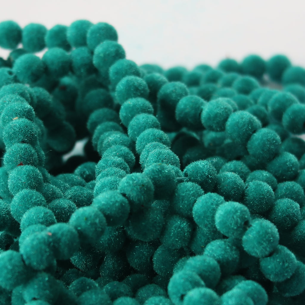 Round furry bead. Flocked plastic bead with a good sized hole. Teal blue colour, 7mm diameter. Approx. 50 beads per 5g pack.