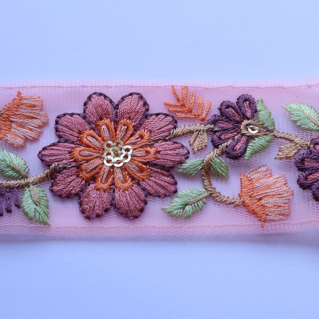 45mm wide net braid. Embroidered floral motifs in a dusky pink and apricot colour with tiny gold sequins on a pink net background. Pattern repeat 95mm. Price is per 25cm, for example to purchase 1m of braid select a quantity of 4 ( 4 x 25cm = 1m)