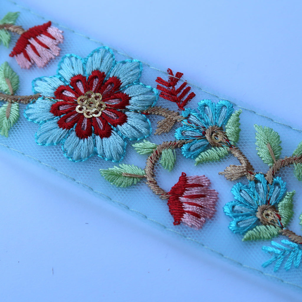 45mm wide net braid. Embroidered floral motifs in a blue and red with tiny gold sequins on a blue net background. Pattern repeat 95mm. Price is per 25cm, for example to purchase 1m of braid select a quantity of 4 (4 x 25cm = 1m)