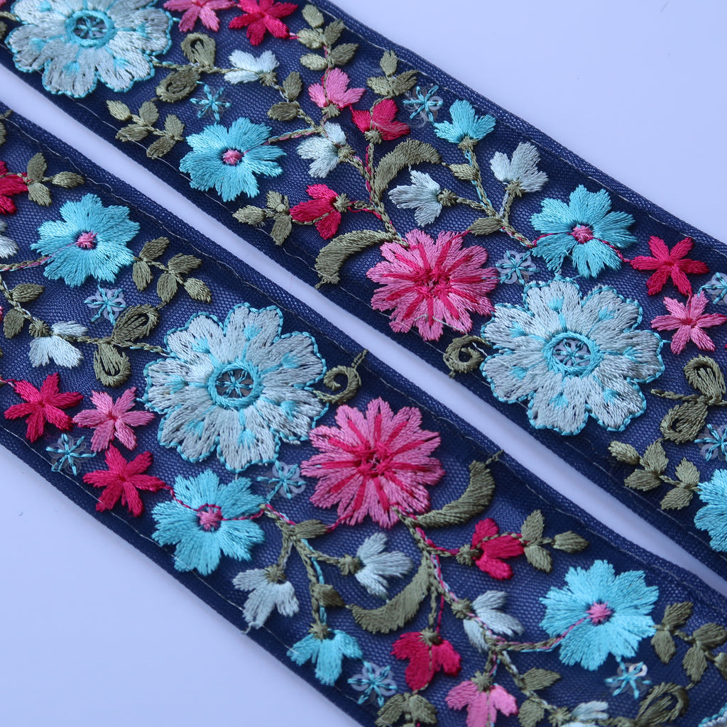50mm wide net braid. Bright embroidered floral motifs with tiny clear sequins on navy blue net background. Pattern repeat 110mm. Price is per 25cm, for example to purchase 1m of braid select a quantity of 4 (4 x 25cm = 1m)